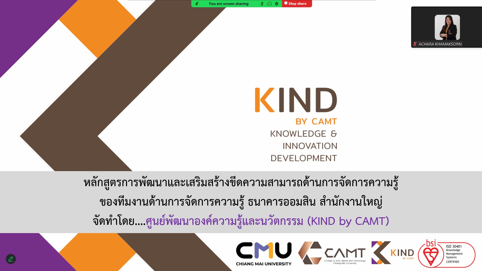 ศูนย์ KIND by CAMT จัดอบรมเชิงปฏิบัติการผ่านระบบออนไลน์ (Zoom) ภายใต้โครงการ "หลักสูตรการพัฒนาและเสริมสร้างขีดความสามารถด้านการจัดการความรู้ " ให้แก่ ทีมงานด้านการจัดการความรู้ ธนาคารออมสิน สำนักงานใหญ่